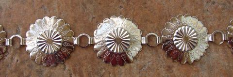 Nickel Silver Engraved Concho Belt. Adjustable in 2 ½“ increments for size. Choice of Approx. 38” or 32" Total length.