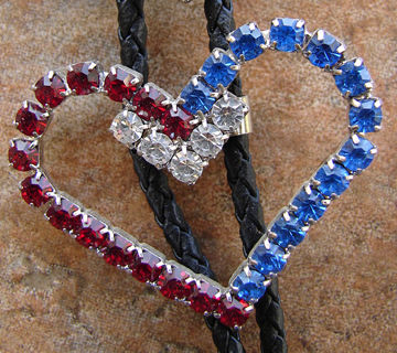 Heart Shape Sparkling Red, Clear, & Blue Rhinestone Bolo. approx. 2” w. x 1¾“ h.