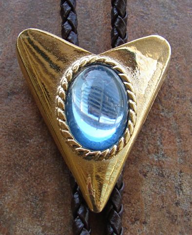 Gold Arrow with Light Blue Glass stone Bolo Tie. Gold tips, black or brown leather strap. Approx. 1¼” wide x 1¾” long. These bolo ties have matching Collar tips, Scarf holders, or Neckties.