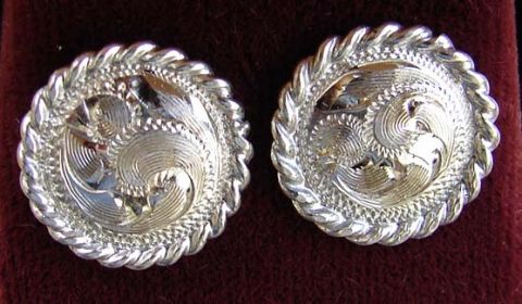 Sterling Silver Engraved Earrings. Round Concho with rope edge design. Hand made by Native American Indians. Conchos approx. 5/8” diameter..