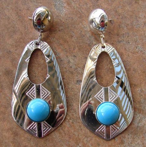 Sterling Silver Plate Drop Earring, Navajo Design with faux turquoise stone. Post style for pierced ears. Lightweight for comfort. Approx 1 ¼ ” wide and 3 ¼ ” long.