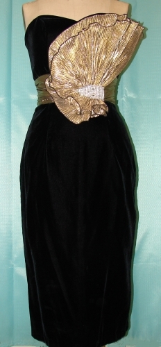 Beautiful strapless, black velvet cocktail dress with gold lame’ waist decoration w / rhinestones. Manufactured in the 90’s with the look of old Hollywood. This lovely dress has never been worn!! Size 9/10 , waist 29 ½” skirt length 29 ½”.