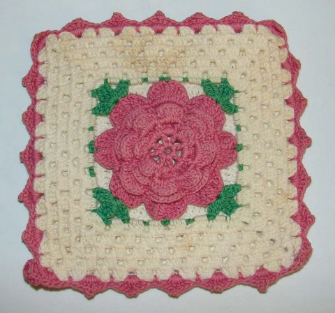 Handmade Pink and white Vintage crochet doily or pot holder. Is stained a little, but in good condition. Size is approx. 5 1/4" square.