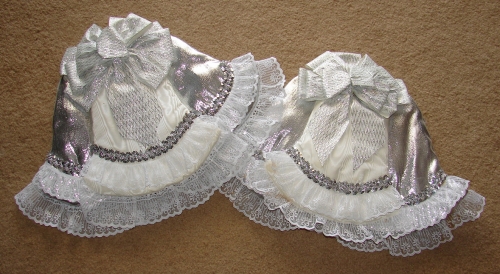 Pair of Handcrafted Bell Wall hangings, circa 1970's.  Made of Silver Lame' and White Moire Fabrics.  Beautiful White lace and Silver sequin trim.  Large White & Silver Bow at top. Plush batting filled. Size Approx. 22" at widest point by 15" high. Comes as pair.