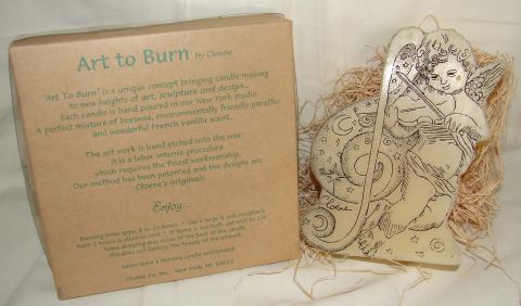 "Art to Burn" by Cloene, A perfect mixture of beeswax, environmentally friendly parafin, and French Vanilla scent. The artwork is hand etched into the wax. Circa 1980's  Approx. 5" high x 3 1/2" wide x 2" deep, in original box.