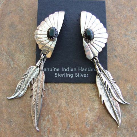 Sterling Silver Engraved with Onyx stone and dangling feathers. Hand crafted by Native Americans. Approx. 5/8" w. x 3" l.