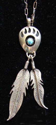 Sterling Silver Handcrafted by Native Americans Bear Claw Symbol with dangling feathers and Turquoise stone.  Pendant approx. 1/2" wide x 2 1/2" dangle, 18" chain