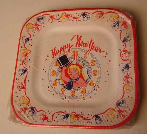 Circa 1950's Happy New Years Dinner Plates. Unopened package of 6. Approx. 8 1/2" x 8 1/2"
