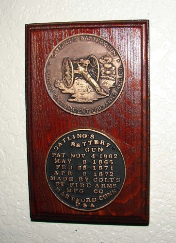 Gatling Gun Wall Plaque. Bronze finish copies of an original Gatling Gun Nomenclature plate and memorial coin. 3" x 6" Walnut finish plaque.