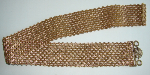 Gold Metallic stretch belt, Fleur-de-lys on star Buckle, matching clasp missing on other end of belt. Approx 26 1/2" long x 2 1/4" wide