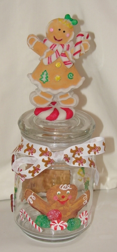 One of a kind! Hand painted and added embellishments make this a perfect jar for storing treats or surprises. 17 oz. size. This one is Gingerbread Cookie themed!