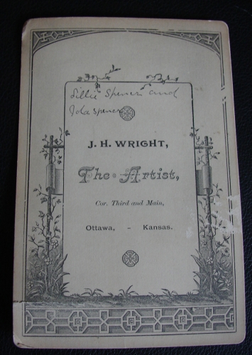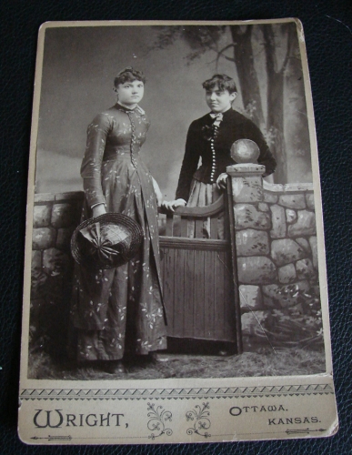 1880's Women Cabinet Card. Title on bottom "Wright", Ottawa, Kansas. Hand written names of Lillie and Ida Spener on back, see photo. Approx size 4 1/4" w. x 6 1/2" h.