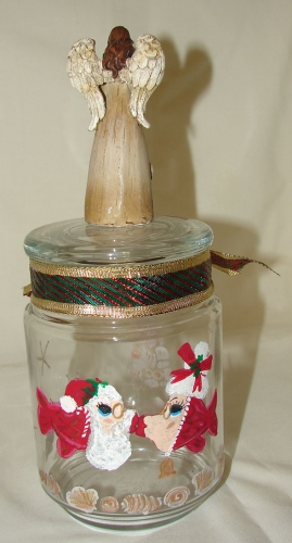 One of a kind! Hand painted and added embellishments make this a perfect jar for storing Christmas candies or treats. 17 oz. size. This one is Seaside Angel themed