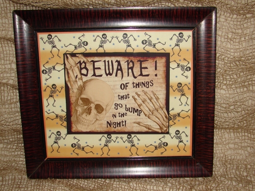 Halloween Themed, "One of A Kind", 2 level, Art Piece. The Art work is comprised of computer graphic designs all done by Jacquelyn Valentino. The center sign is elevated from the skeleton border. Printed on quality photo paper. Placed behind glass in a beautiful tiger striped Antique frame that measures17 1/2" x 15" 1/2". Frame Circa early 1900's.