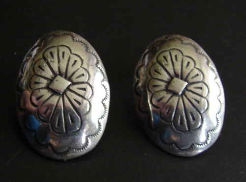 Sterling Silver Engraved Concho Earrings. Hand crafted by Native Americans. Approx. 7/8" w. x 1 1/4" l.