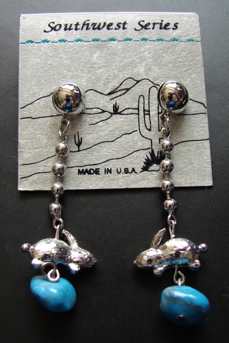 Silver Post Earrings. Jack Rabbit dangling from silver beads with Turquoise Stone. Approx. ¾ “w. x 2 ½ “ l.