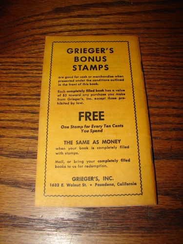 Grieger's redemption stamp book, circa 1970's, Pasadena, CA