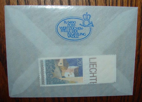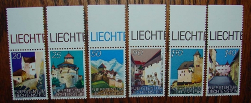 6 Collectable stamps from Liechtenstein 20, 25, 50, 110, 140. Each wih a different area scene and labeled "Fuerstentum Liechtenstein". approx. 1" x 2 1/2"