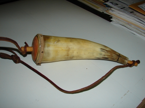 Handcrafted powder horn for black powder, made from cow/bull horn. Approx 13" from tip to tip along outside curve.
