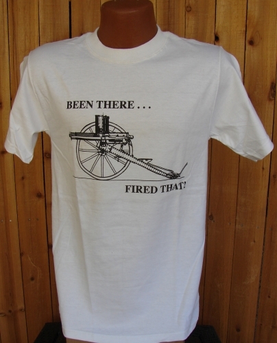 Our Fruit of the Loom 100% Cotton shirt is adorned with a reproduced original line art side elevation of an 1871 Gatling Gun and the slogan "BEEN THERE FIRED THAT". On the back side is one of the Museum's line drawing logos of Artillery firing on a field of battle.
